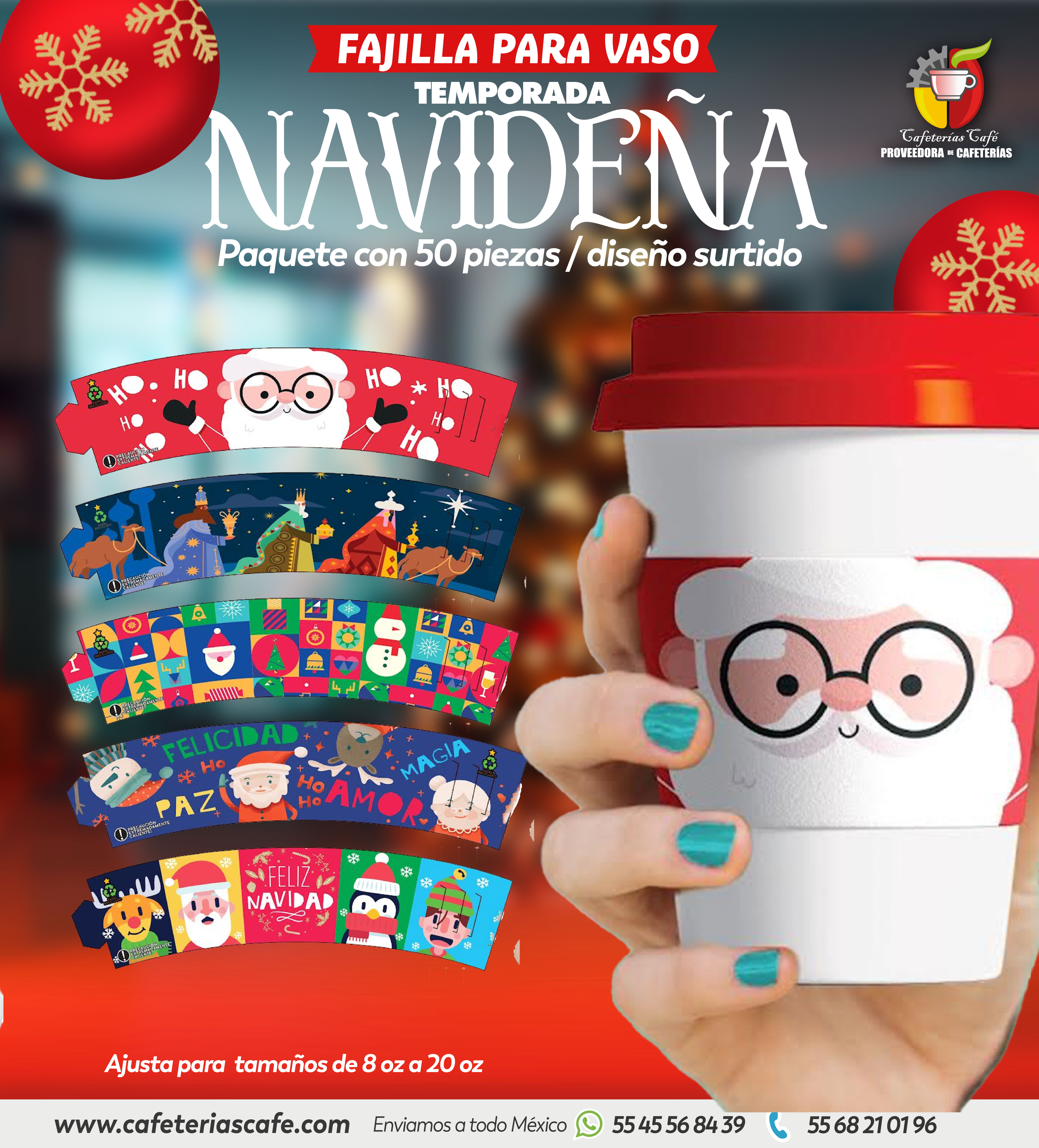 Fajilla o manga edicion navideña caja 50 piezas. Para vaso de 8-12-16-20 onz. Diseños surtidos