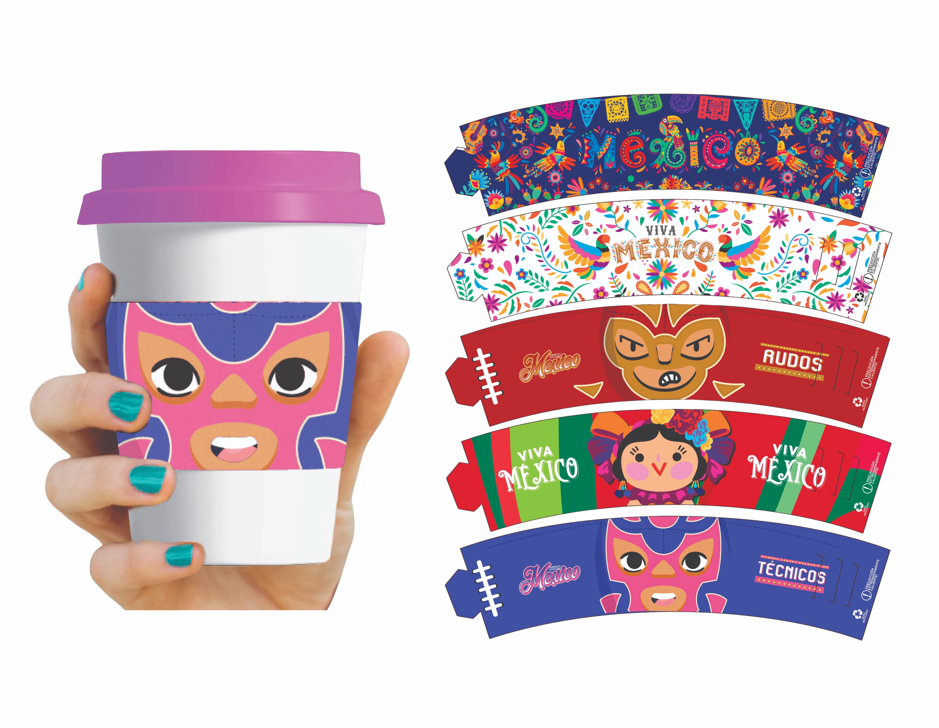 Fajilla cintillo aislante manga edición Fiestas Patrias. 50 pz Ajusta en vaso de papel: 8 oz, 10 oz, 12 oz, 16 oz, 20 oz. Paquete surtido