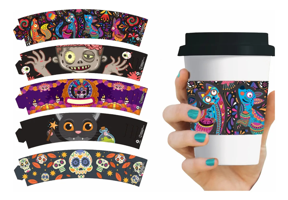 Fajilla o manga edición Día de Muertos Surtida. 50 pz Ajusta en vaso de papel: 8 oz, 10 oz, 12 oz, 16 oz, 20 oz.